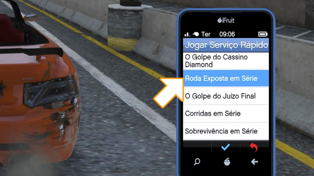 Escolha a opção "Roda Exposta em Série" no smartphone de GTA 5 para entrar na disputa — Foto: Reprodução/Rafael Monteiro.